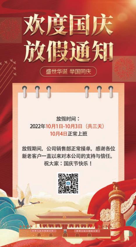 為慶祝國慶節到來,英龍公司2022年國慶(qing)假(jia)期安排(pai)如(ru)下(xia):2022年10月1日至10月3日(放(fang)假三天),10月4日正(zheng)常上班。放(fang)假(jia)期間,公司銷售部(bu)正常接(jie)單,不(bu)安排發貨,如給您造成(cheng)不(bu)便之處,敬請諒解。